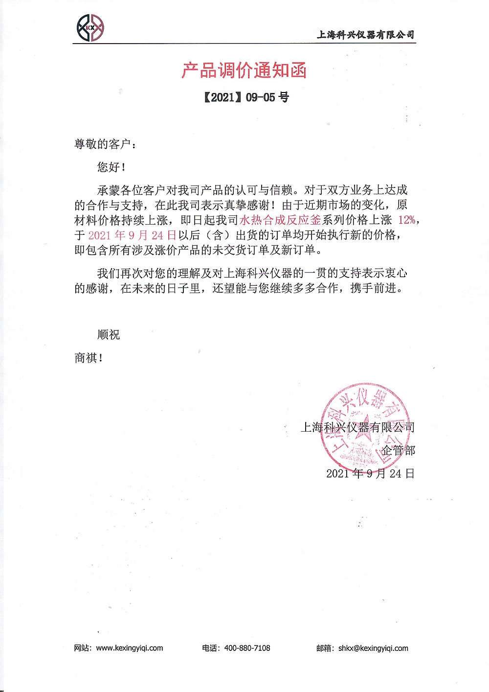 承蒙各位客戶對我司產(chǎn)品的認可與信賴。對于雙方業(yè)務上達成的合作與支持,在此我司表示真摯感謝!由于近期市場的變化,原材料價格持續(xù)上漲,即日起我司水熱合成反應釜系列價格上漲 12%,2021 年 9 月 24 日以后(含)出貨的訂單均開始執(zhí)行新的價格,既包含所有涉及漲價產(chǎn)品的未交貨訂單及新訂單。
