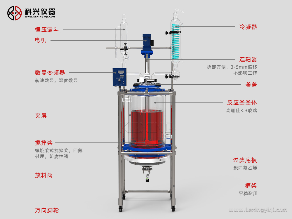 主要用于制藥、化工、實驗室等機構(gòu)的有機合成實驗室用中式設備,用于有機物合成實驗中,是生化制藥中的主要設備之一。釜體為雙層玻璃燒結(jié)而成,雙層之間可通過冷卻液和加熱液。釜底過濾篩板的設計,讓設備能承受100KG反應液的壓力。過濾裝置采用法蘭和四氟材料制成與釜體相連,過濾器為玻璃砂芯,方便拆卸清洗更換。